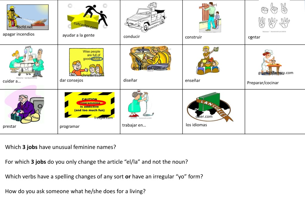 easyvectors.com apagarincendios ayudar a la gente conducir contar construir sbcfd.net darconsejos diseñar enseñar cuidar a… Preparar/cocinar cutcaster.com los idiomas trabajar en… prestar programar graphicsfactory.com clker.com dircoolclips.com Which 3 jobs have unusual feminine names? For which 3 jobs do you only change the article “el/la” and not the noun? Which verbs have a spelling changes of any sort or have an irregular “yo” form? How do you ask someone what he/she does for a living? christart.com freepik.com