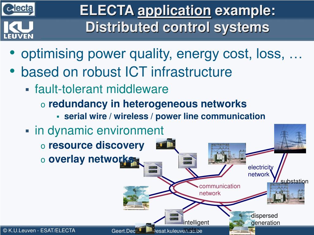 ELECTA application example:Distributed control systems electricity network substation communication network dispersed generation intelligent meter • optimising power quality, energy cost, loss, … • based on robust ICT infrastructure • fault-tolerant middleware • redundancy in heterogeneous networks • serial wire / wireless / power line communication • in dynamic environment • resource discovery • overlay networks Geert.Deconinck@esat.kuleuven.ac.be