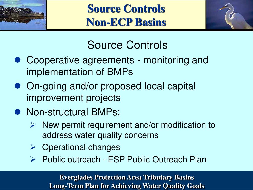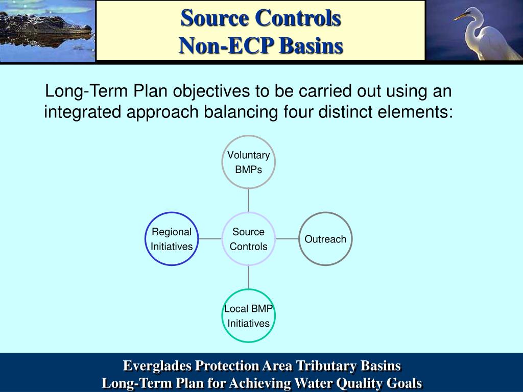 Long-Term Plan Update Introduction • In general, the recommended strategy in the Non-ECP basins is to rely upon source controls and full integration with CERP to achieve water quality standards • In addition to the Non-ECP Permit requirements, Part 3 of the LTP (Pre-2006 Strategies, ESP Basins) defines supplemental strategies and approaches for water quality improvement in discharges from the Non-ECP Basins