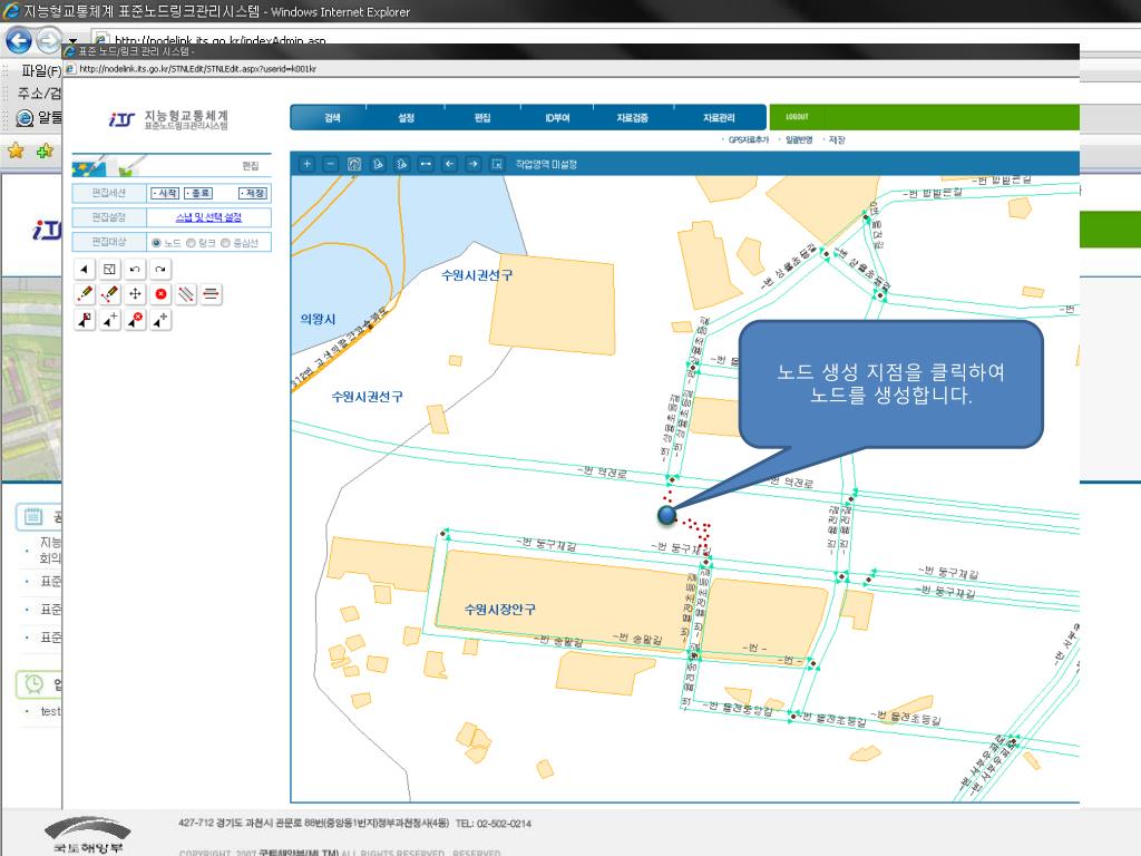 실습자료. 표준 노드/링크 실습 -GPS 자료를 이용한 편집 -. 2009. 06. 강희찬 연구원. 표준 노드 - 링크실습자료. 1. 관리자 로그인. 표준 노드 / 링크 관리시스템 로그인 베너를 클릭합니다. 아이디와 비밀번호를 넣고 로그인 버튼을 누릅니다. 아이디와 비밀번호를 넣고 로그인 버튼을 누릅니다. TEST ID. ******. 아이디와 비밀번호를 넣고 로그인 버튼을 누릅니다. GPKI 인증을 시행 합니다. TEST ID. ******. GPKI 인증을 시행 합니다 .
