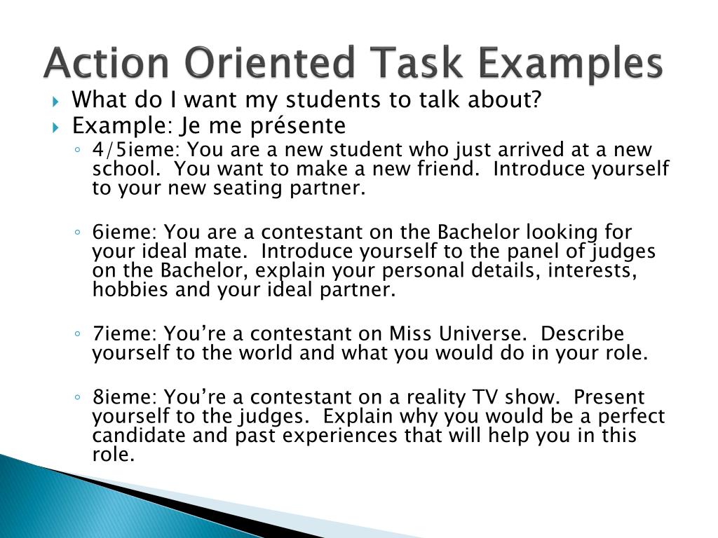 Action Oriented Task Examples • What do I want my students to talk about? • Example: Je me présente • 4/5ieme: You are a new student who just arrived at a new school. You want to make a new friend. Introduce yourself to your new seating partner. • 6ieme: You are a contestant on the Bachelor looking for your ideal mate. Introduce yourself to the panel of judges on the Bachelor, explain your personal details, interests, hobbies and your ideal partner. • 7ieme: You’re a contestant on Miss Universe. Describe yourself to the world and what you would do in your role. • 8ieme: You’re a contestant on a reality TV show. Present yourself to the judges. Explain why you would be a perfect candidate and past experiences that will help you in this role.