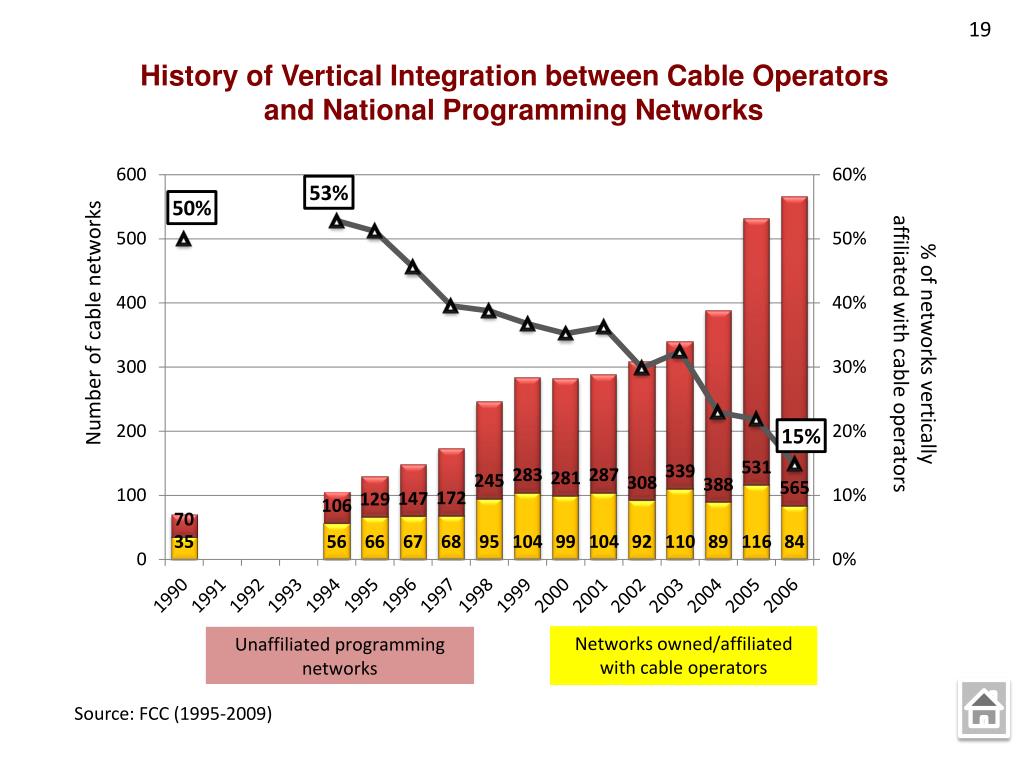 18 Ownership Status of the 65 Largest National Cable Programming Networks, 1994 Total networks Vertically integrated at launch jointly owned by 2 or more MSOs at launch * Include all basic and PPV networks reaching at least 10%, and premium networks reaching at least 1% of MVPD households as of the end of 1994. Source: Compiled from Waterman & Weiss (1997) based on Cable TV Factbook, Paul KaganAssociates