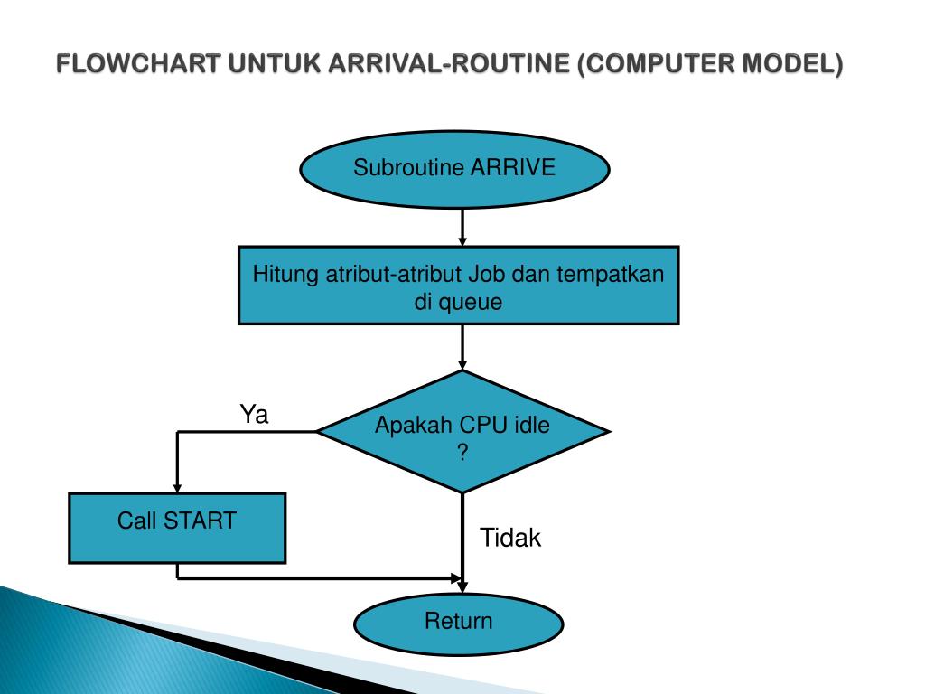 FLOWCHART UNTUK ARRIVAL-ROUTINE (COMPUTER MODEL) Subroutine ARRIVE Hitung atribut-atribut Job dan tempatkan di queue Ya Apakah CPU idle ? Call START Tidak Return