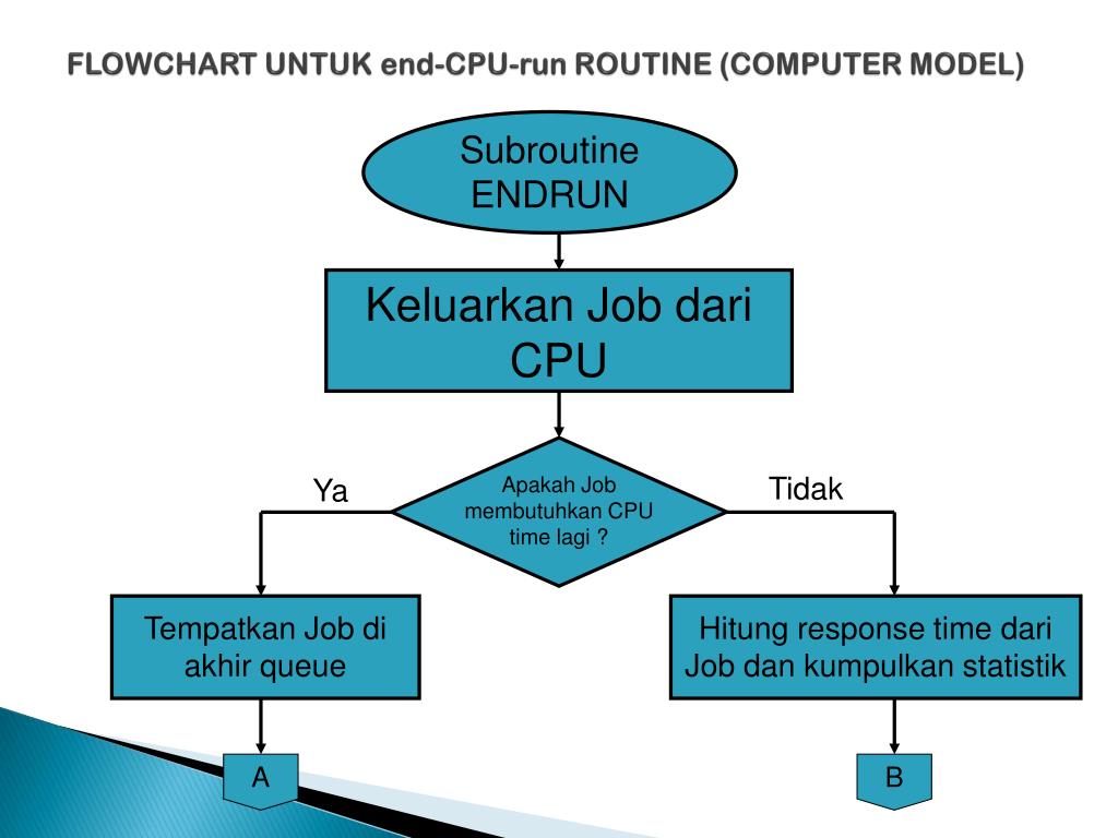 FLOWCHART UNTUK end-CPU-run ROUTINE (COMPUTER MODEL) Subroutine ENDRUN Keluarkan Job dari CPU Tidak Ya Apakah Job membutuhkan CPU time lagi ? Tempatkan Job di akhir queue Hitung response time dari Job dan kumpulkan statistik A B