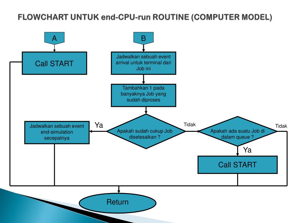 FLOWCHART UNTUK end-CPU-run ROUTINE (COMPUTER MODEL) A B Jadwalkan sebuah event arrival untuk terminal dari Job ini Call START Tambahkan 1 pada banyaknya Job yang sudah diproses Ya Tidak Jadwalkan sebuah event end-simulation secepatnya Tidak Apakah sudah cukup Job diselesaikan ? Apakah ada suatu Job di dalam queue ? Ya Call START Return