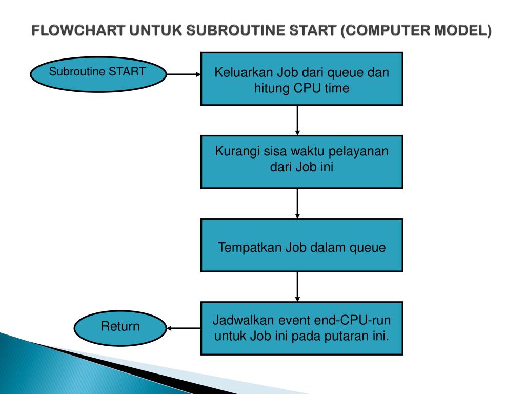 FLOWCHART UNTUK SUBROUTINE START (COMPUTER MODEL) Subroutine START Keluarkan Job dari queue dan hitung CPU time Kurangi sisa waktu pelayanan dari Job ini Tempatkan Job dalam queue Jadwalkan event end-CPU-run untuk Job ini pada putaran ini. Return