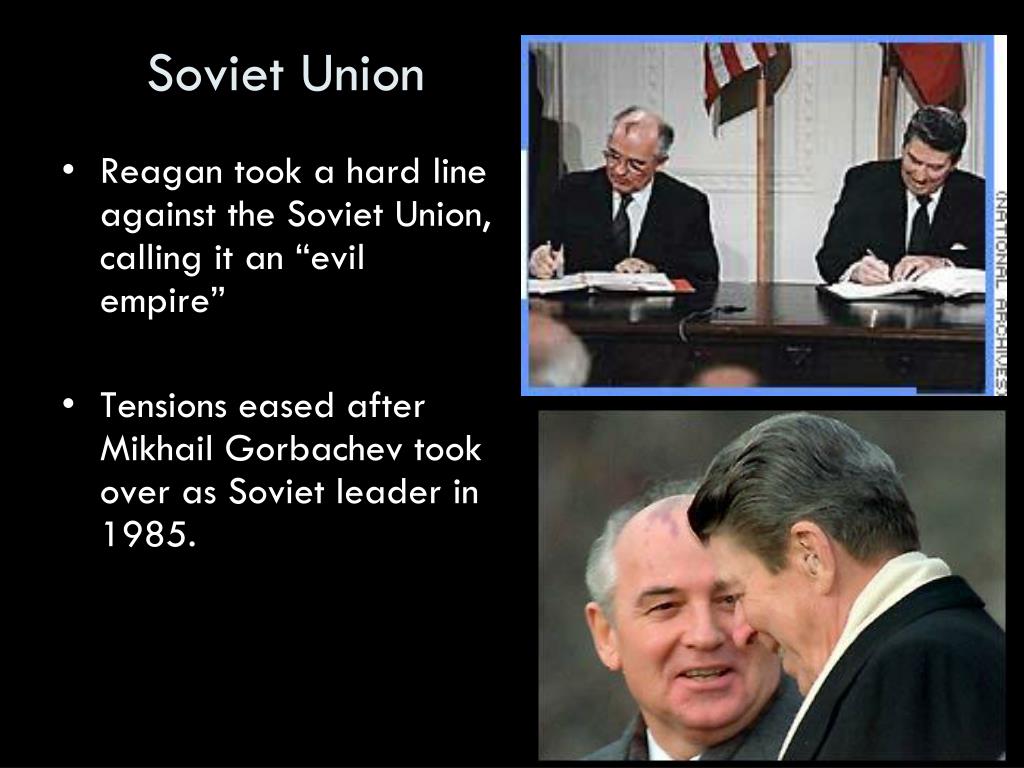Soviet Union • Reagan took a hard line against the Soviet Union, calling it an “evil empire” • Tensions eased after Mikhail Gorbachev took over as Soviet leader in 1985.