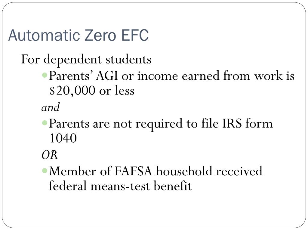 Automatic Zero EFC For dependent students • Parents’ AGI or income earned from work is $20,000 or less and • Parents are not required to file IRS form 1040 OR • Member of FAFSA household received federal means-test benefit