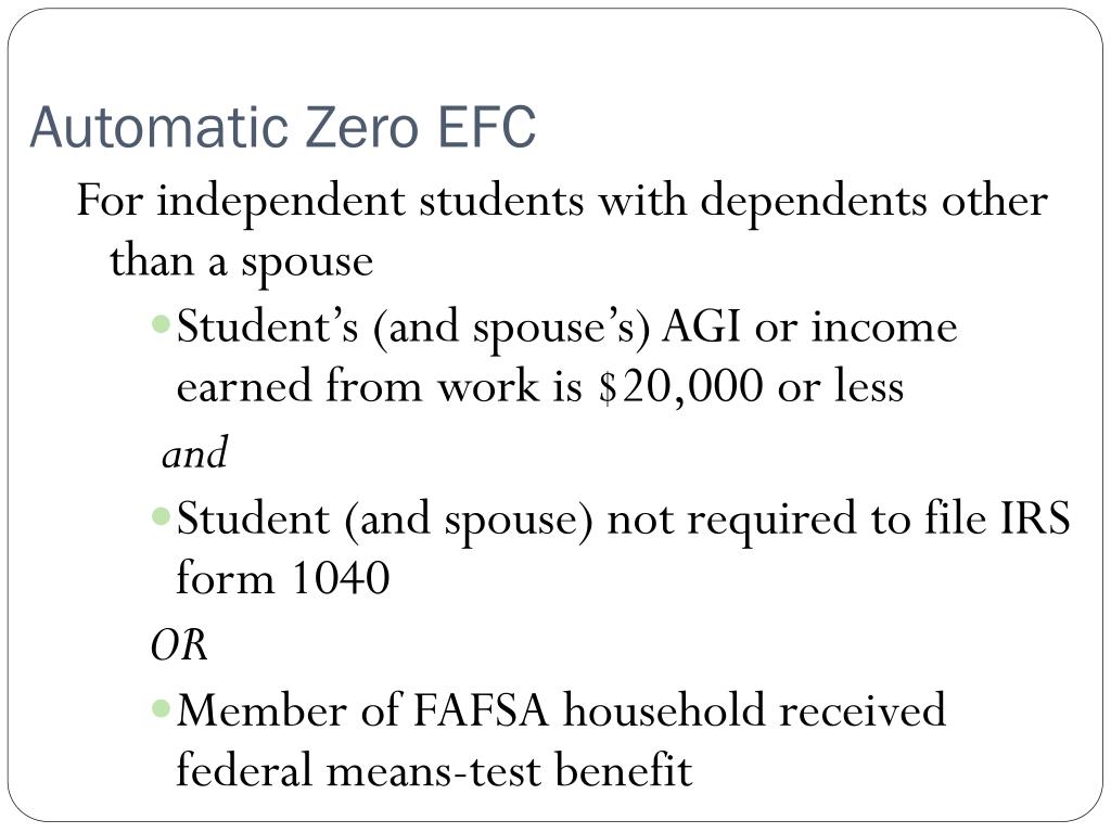 Automatic Zero EFC For independent students with dependents other than a spouse • Student’s (and spouse’s) AGI or income earned from work is $20,000 or less and • Student (and spouse) not required to file IRS form 1040 OR • Member of FAFSA household received federal means-test benefit