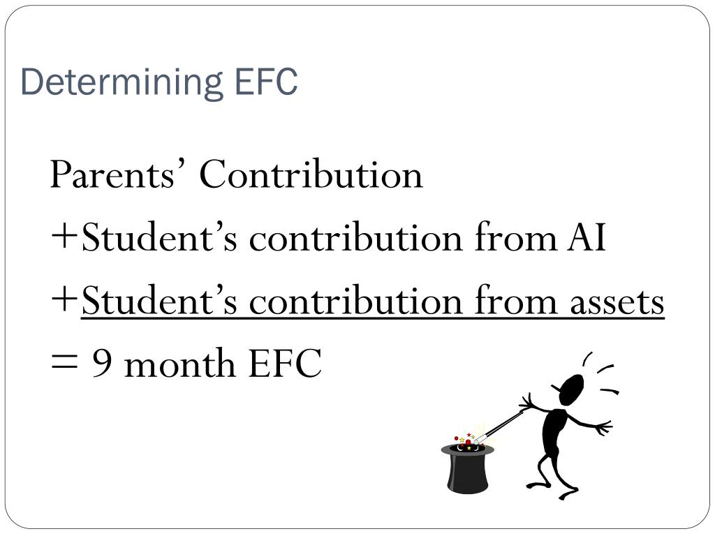 Determining EFC Parents’ Contribution +Student’s contribution from AI +Student’s contribution from assets = 9 month EFC