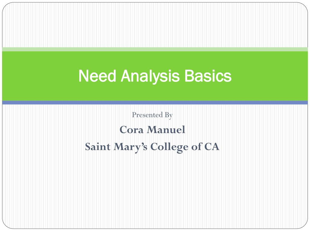 Need Analysis Basics Presented By Cora Manuel Saint Mary’s College of CA