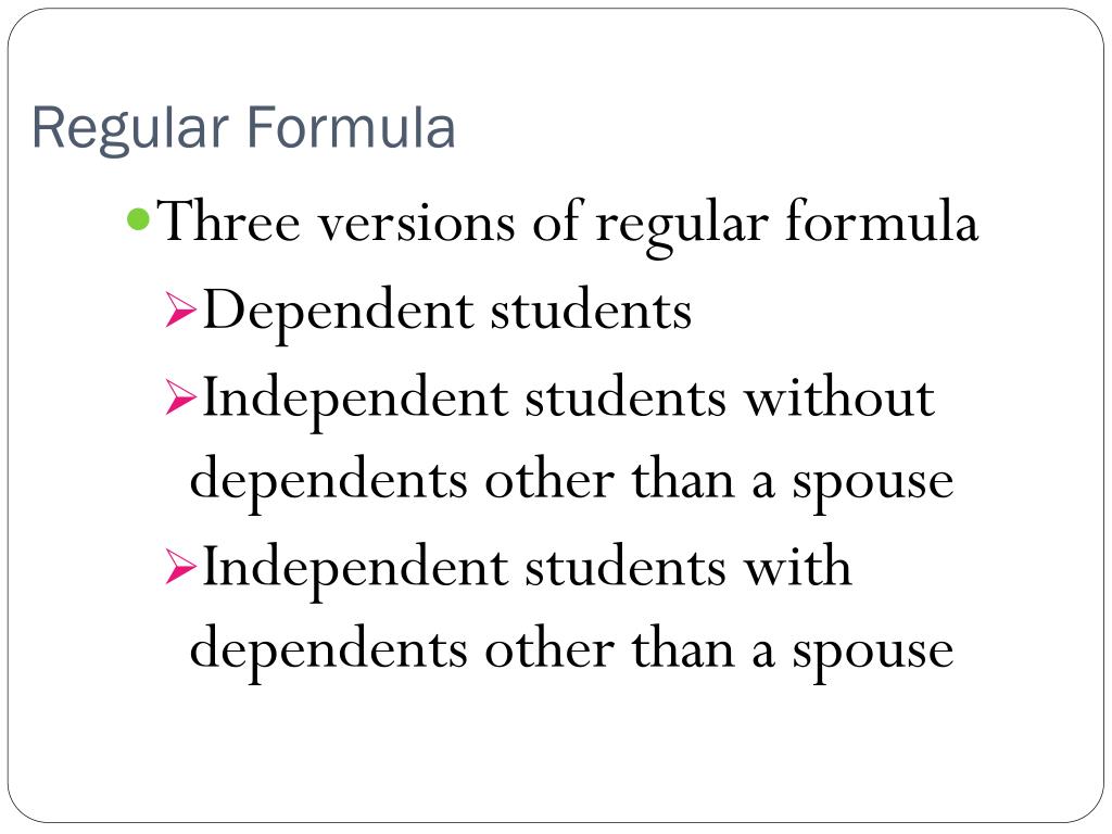 Regular Formula • Three versions of regular formula • Dependent students • Independent students without dependents other than a spouse • Independent students with dependents other than a spouse