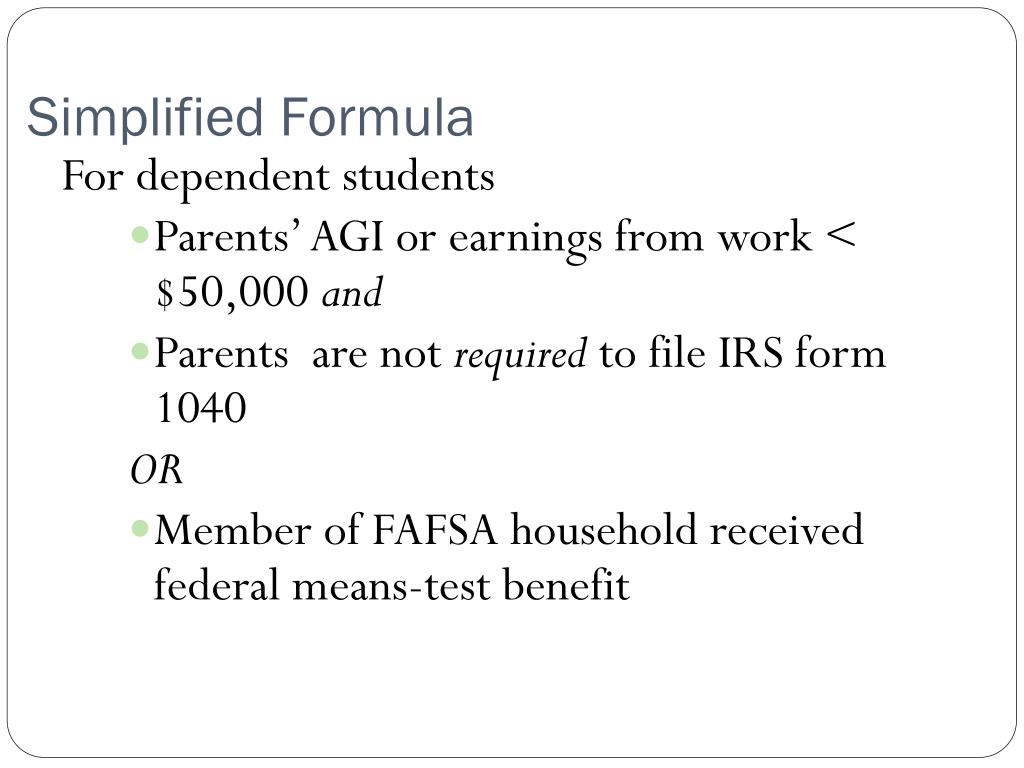 Simplified Formula For dependent students • Parents’ AGI or earnings from work < $50,000 and • Parents are not required to file IRS form 1040 OR • Member of FAFSA household received federal means-test benefit