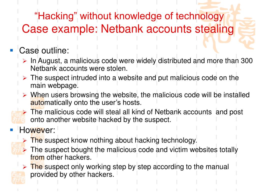 “Hacking” without knowledge of technologyCase example: Netbank accounts stealing • Case outline: • In August, a malicious code were widely distributed and more than 300 Netbank accounts were stolen. • The suspect intruded into a website and put malicious code on the main webpage. • When users browsing the website, the malicious code will be installed automatically onto the user’s hosts. • The malicious code will steal all kind of Netbank accounts and post onto another website hacked by the suspect. • However: • The suspect know nothing about hacking technology. • The suspect bought the malicious code and victim websites totally from other hackers. • The suspect only working step by step according to the manual provided by other hackers.