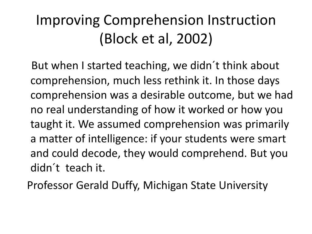 Improving Comprehension Instruction (Block et al, 2002) Butwhen I startedteaching, wedidn´tthinkaboutcomprehension, much less rethink it. In thosedayscomprehensionwas a desirableoutcome, butwehad no real understanding of how it worked or how you taught it. Weassumedcomprehensionwasprimarily a matter of intelligence: if your students were smart and coulddecode, theywouldcomprehend. But you didn´tteach it. Professor Gerald Duffy, Michigan State University