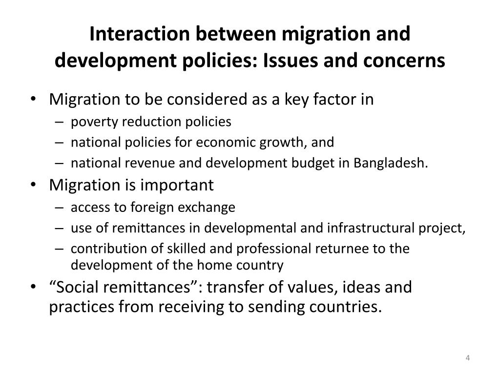 Interaction between migration and development policies: Issues and concerns • Migration to be considered as a key factor in • poverty reduction policies • national policies for economic growth, and • national revenue and development budget in Bangladesh. • Migration is important • access to foreign exchange • use of remittances in developmental and infrastructural project, • contribution of skilled and professional returnee to the development of the home country • “Social remittances”: transfer of values, ideas and practices from receiving to sending countries.