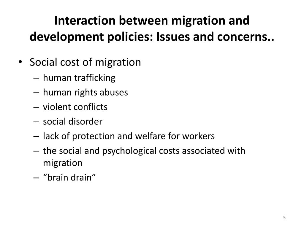Interaction between migration and development policies: Issues and concerns.. • Social cost of migration • human trafficking • human rights abuses • violent conflicts • social disorder • lack of protection and welfare for workers • the social and psychological costs associated with migration • “brain drain”