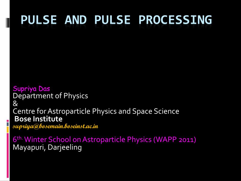 Supriya Das Department of Physics & Centre for Astroparticle Physics and Space Science Bose Institute supriya@bosemain.boseinst.ac.in 6th. Winter School on Astroparticle Physics (WAPP 2011) Mayapuri, Darjeeling Pulse and Pulse Processing