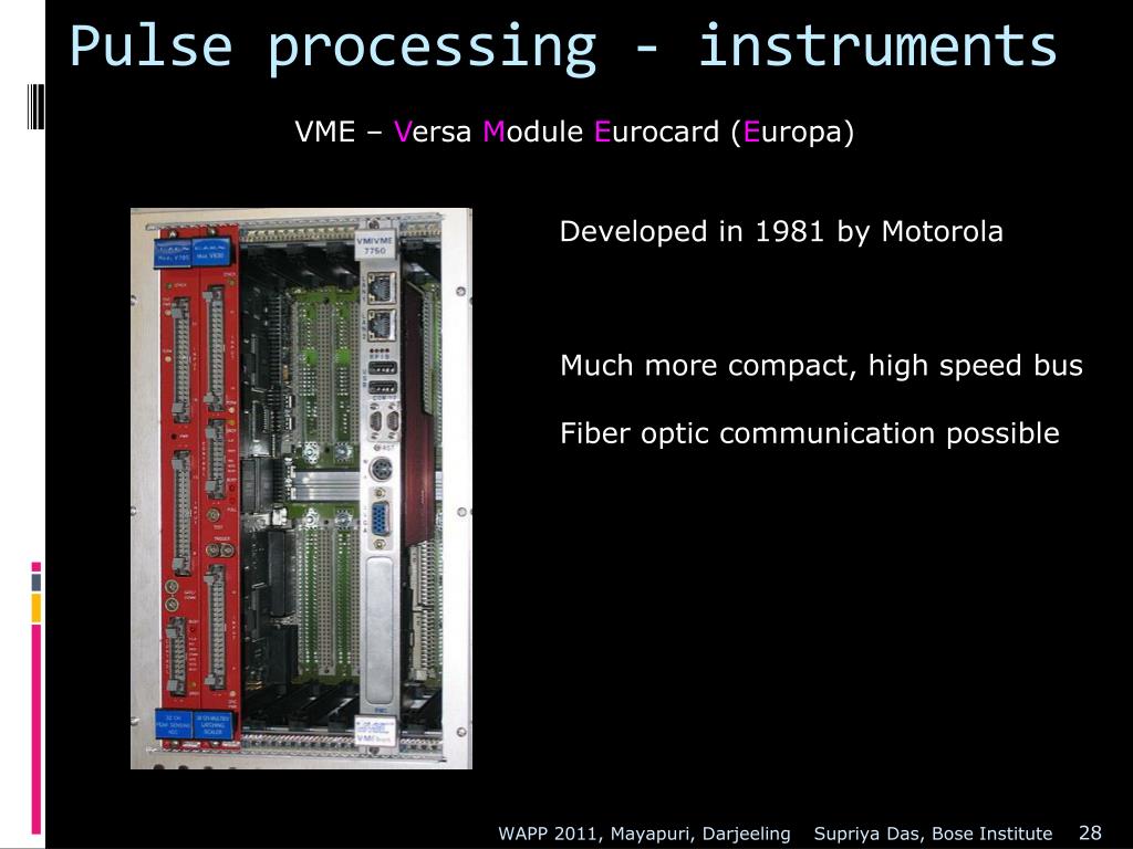 Pulse processing - instruments VME – Versa Module Eurocard (Europa) Developed in 1981 by Motorola Much more compact, high speed bus Fiber optic communication possible WAPP 2011, Mayapuri, Darjeeling