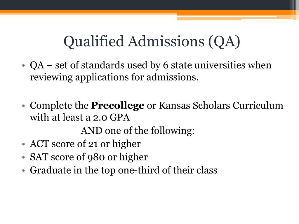 Qualified Admissions (QA) • QA – set of standards used by 6 state universities when reviewing applications for admissions. • Complete the Precollege or Kansas Scholars Curriculum with at least a 2.0 GPA AND one of the following: • ACT score of 21 or higher • SAT score of 980 or higher • Graduate in the top one-third of their class