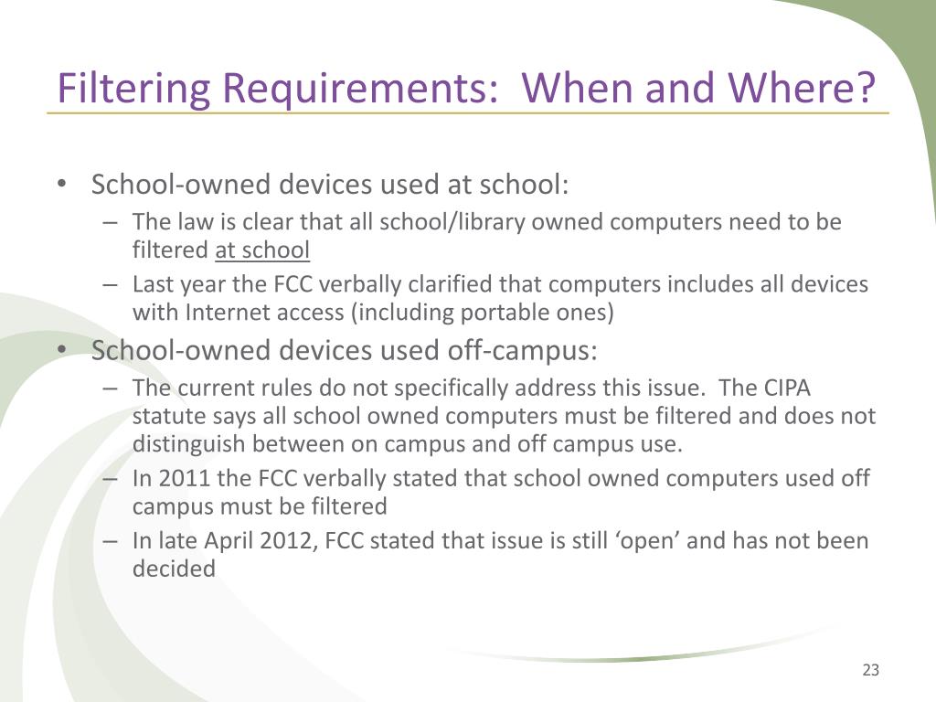 Filtering Requirements: When and Where? • School-owned devices used at school: • The law is clear that all school/library owned computers need to be filtered at school • Last year the FCC verbally clarified that computers includes all devices with Internet access (including portable ones) • School-owned devices used off-campus: • The current rules do not specifically address this issue. The CIPA statute says all school owned computers must be filtered and does not distinguish between on campus and off campus use. • In 2011 the FCC verbally stated that school owned computers used off campus must be filtered • In late April 2012, FCC stated that issue is still ‘open’ and has not been decided