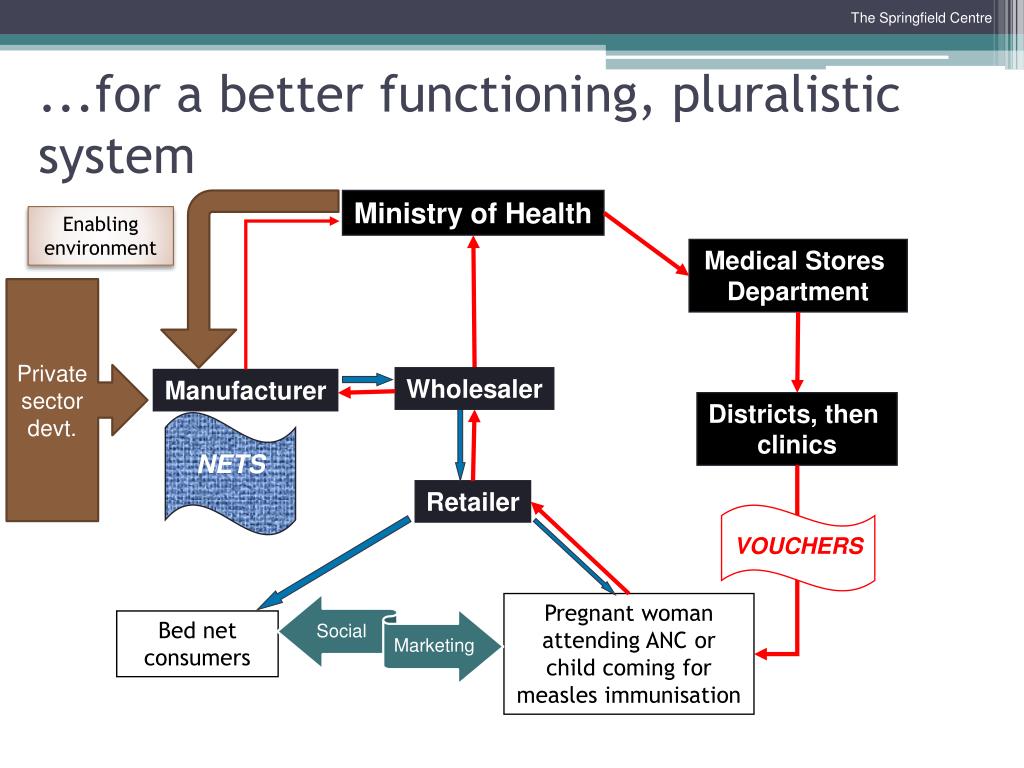 ...for a better functioning, pluralistic system Ministry of Health Enabling environment Medical Stores Department Private sector devt. Wholesaler Manufacturer Districts, then clinics NETS Retailer VOUCHERS Pregnant woman attending ANC or child coming for measles immunisation Bed net consumers