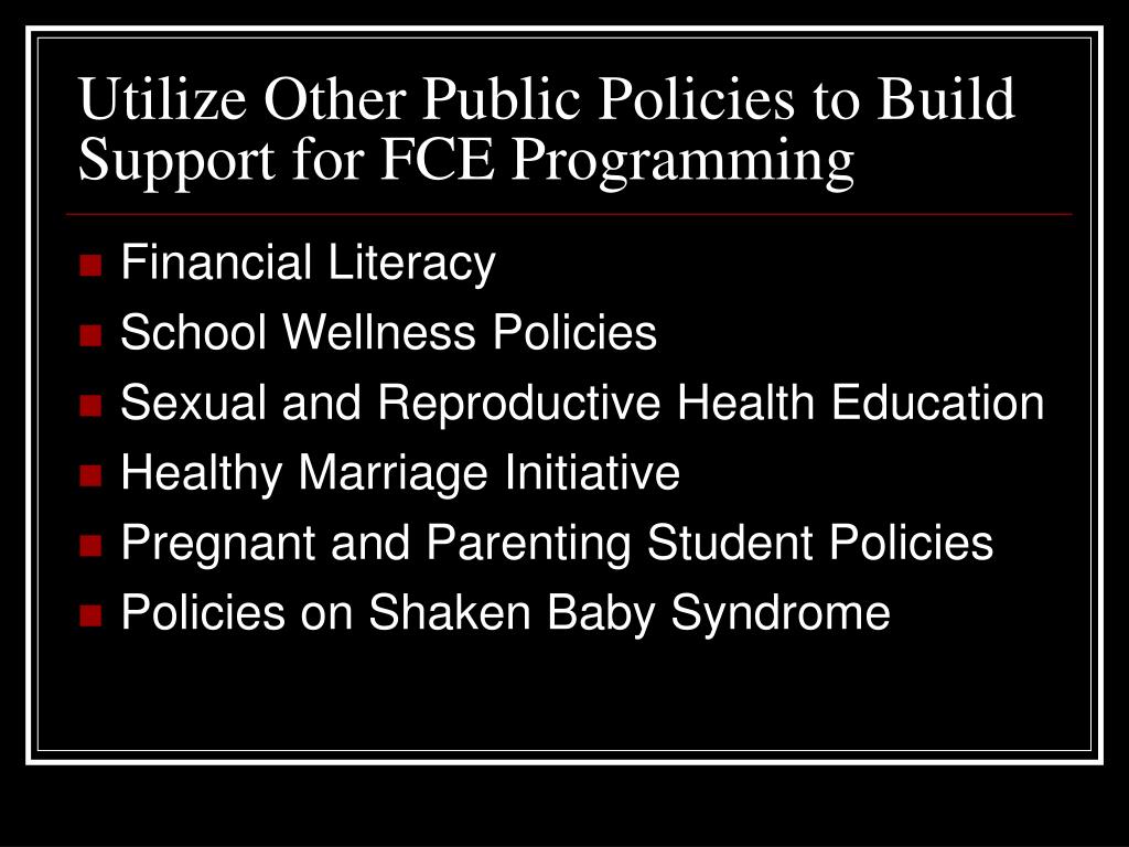 Utilize Other Public Policies to Build Support for FCE Programming • Financial Literacy • School Wellness Policies • Sexual and Reproductive Health Education • Healthy Marriage Initiative • Pregnant and Parenting Student Policies • Policies on Shaken Baby Syndrome