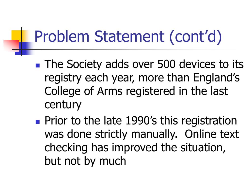 Problem Statement (cont’d) • The Society adds over 500 devices to its registry each year, more than England’s College of Arms registered in the last century • Prior to the late 1990’s this registration was done strictly manually. Online text checking has improved the situation, but not by much