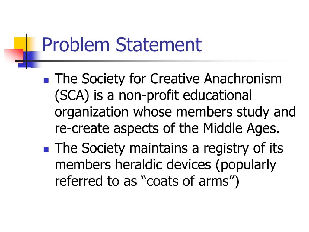 Harold the Herald: An Automated Heraldic Conflict Checking System by David P. Salley. Problem Statement. The Society for Creative Anachronism (SCA) is a non-profit educational organization whose members study and re-create aspects of the Middle Ages.