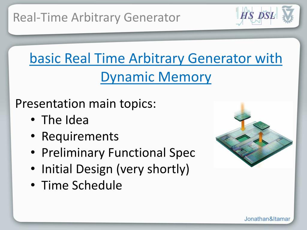 basic Real Time Arbitrary Generator with Dynamic Memory. By: Jonathan Cohen Itamar Friedman Instructor: Michael Yampolsky At the High Speed Digital System Lab. Real-Time Arbitrary Generator. Real-Time Arbitrary Generator. basic Real Time Arbitrary Generator with Dynamic Memory.
