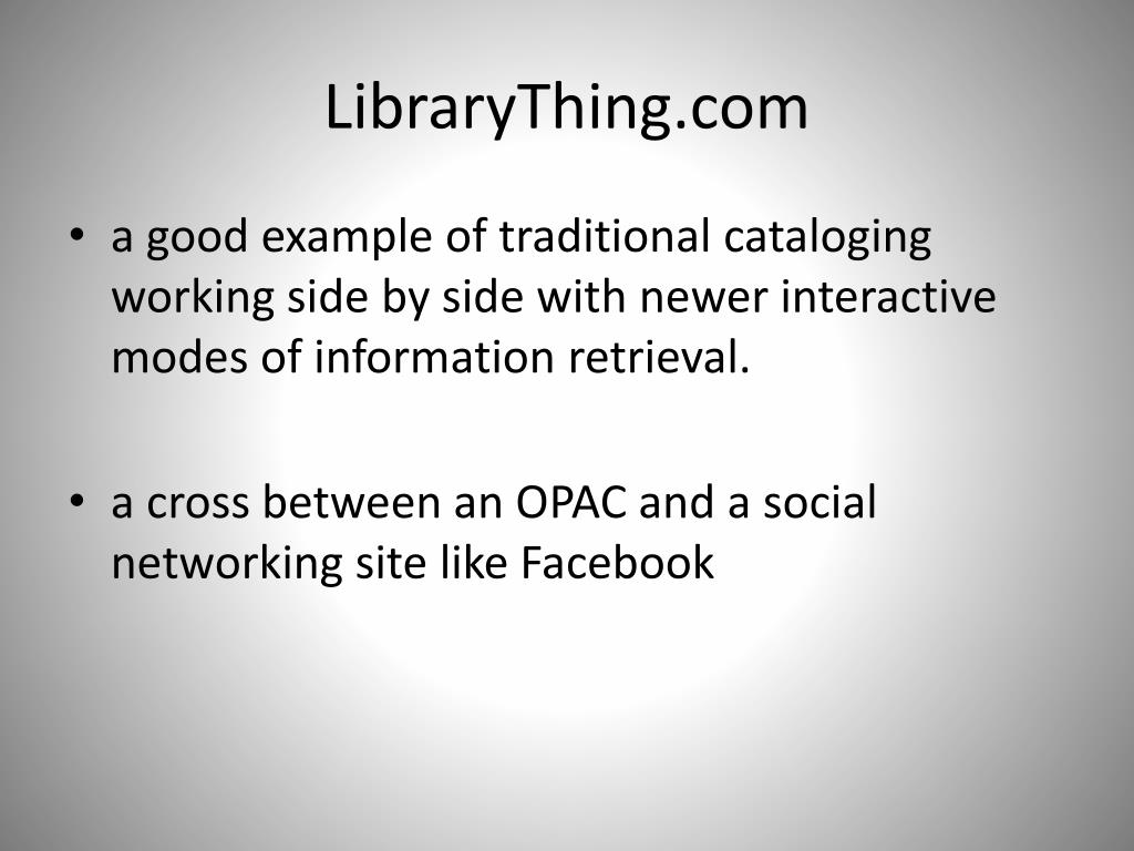 LibraryThing.com • a good example of traditional cataloging working side by side with newer interactive modes of information retrieval. • a cross between an OPAC and a social networking site like Facebook