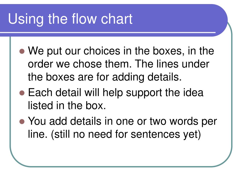 Using the flow chart • We put our choices in the boxes, in the order we chose them. The lines under the boxes are for adding details. • Each detail will help support the idea listed in the box. • You add details in one or two words per line. (still no need for sentences yet)