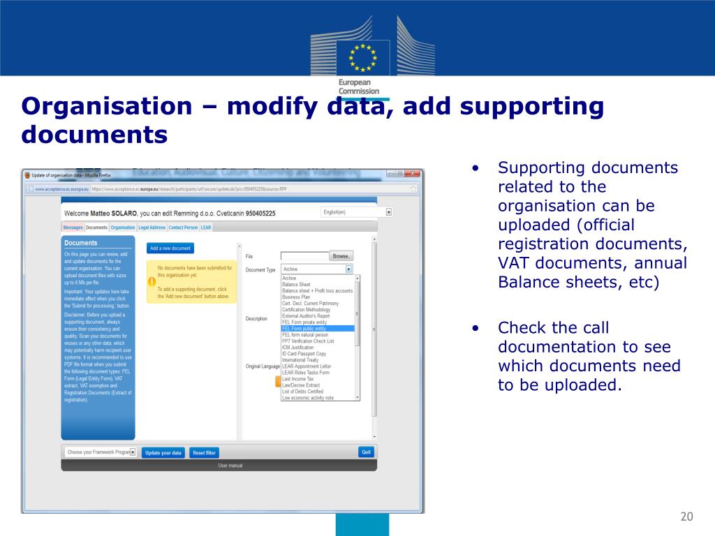 Organisation – modify data, add supporting documents Supporting documents related to the organisation canbeuploaded (official registration documents, VAT documents, annual Balance sheets, etc) Check the call documentation to seewhich documents need to beuploaded.