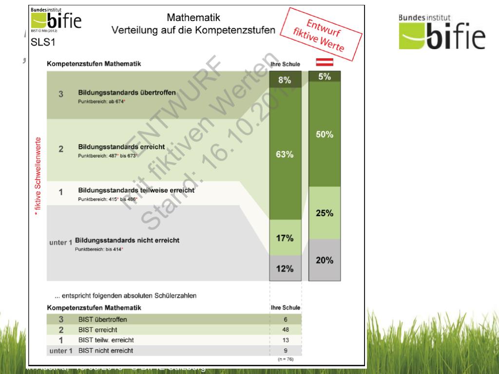 Standard Setting • Standard settinggoal: meaningfullydescribedlevels • criterion-referenced • Phases: 4 levels in Austria in mostdomains 0: standards not reached 1: partiallyreachedstandards 2: reachedstandards 3: exceededstandards Easy tounderstandfor „laymen“