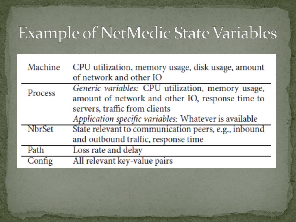NetMedic Inference Problem • Model the network as a dependency graph between components: application processes, host machines, and configuration elements. • There is a direct edge between two components if the source directly impacts the destination. • The dependency graph may contain cycles. • Netmedic automatically constructs the dependency graph. • The state of a component at a given time consists of visible and invisible parts.