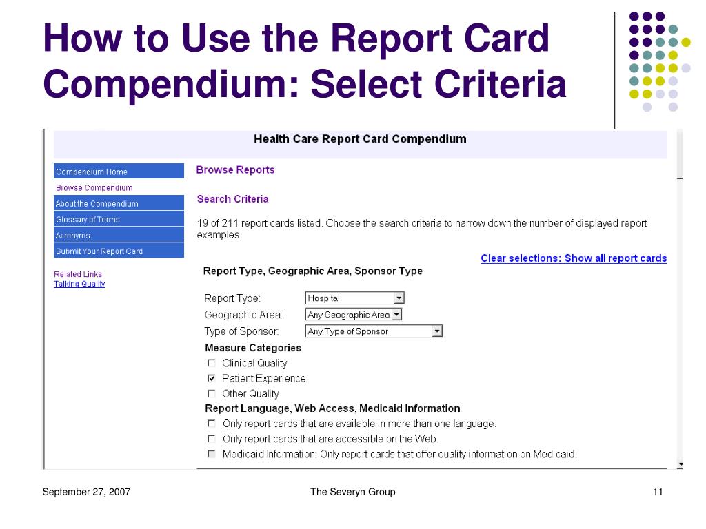 How to Use the Report Card Compendium: Select Criteria The Severyn Group