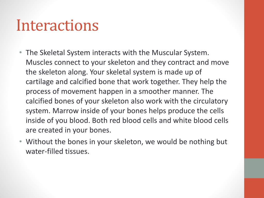 Interactions • The Skeletal System interacts with the Muscular System. Muscles connect to your skeleton and they contract and move the skeleton along. Your skeletal system is made up of cartilage and calcified bone that work together. They help the process of movement happen in a smoother manner. The calcified bones of your skeleton also work with the circulatory system. Marrow inside of your bones helps produce the cells inside of you blood. Both red blood cells and white blood cells are created in your bones. • Without the bones in your skeleton, we would be nothing but water-filled tissues.