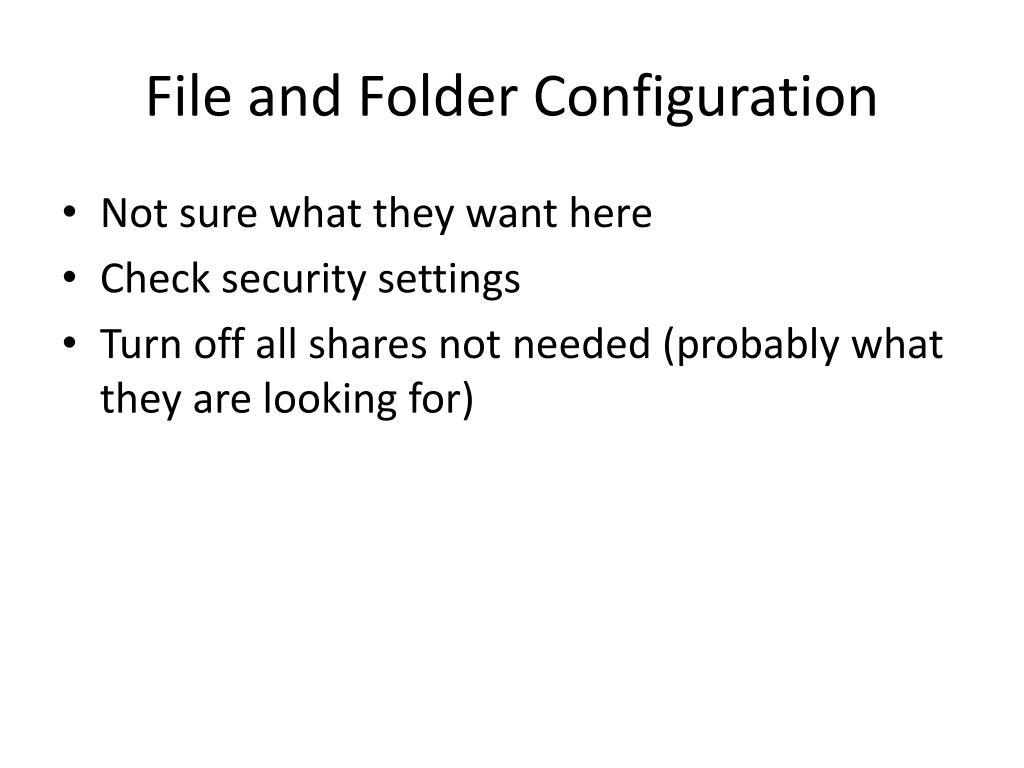 File and Folder Configuration • Not sure what they want here • Check security settings • Turn off all shares not needed (probably what they are looking for)