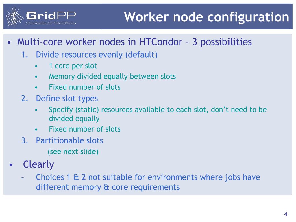 Worker node configuration • Multi-core worker nodes in HTCondor – 3 possibilities • Divide resources evenly (default) • 1 core per slot • Memory divided equally between slots • Fixed number of slots • Define slot types • Specify (static) resources available to each slot, don’t need to be divided equally • Fixed number of slots • Partitionable slots (see next slide) • Clearly • Choices 1 & 2 not suitable for environments where jobs have different memory & core requirements