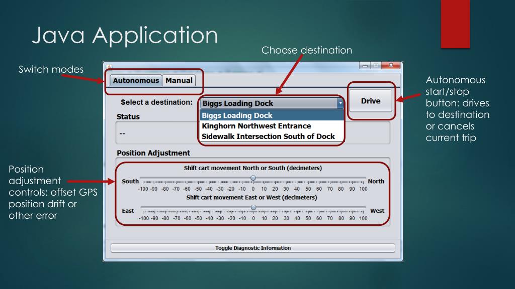 Choose destination Java Application Autonomous start/stop button: drives to destination or cancels current trip Position adjustment controls: offset GPS position drift or other error Switch modes