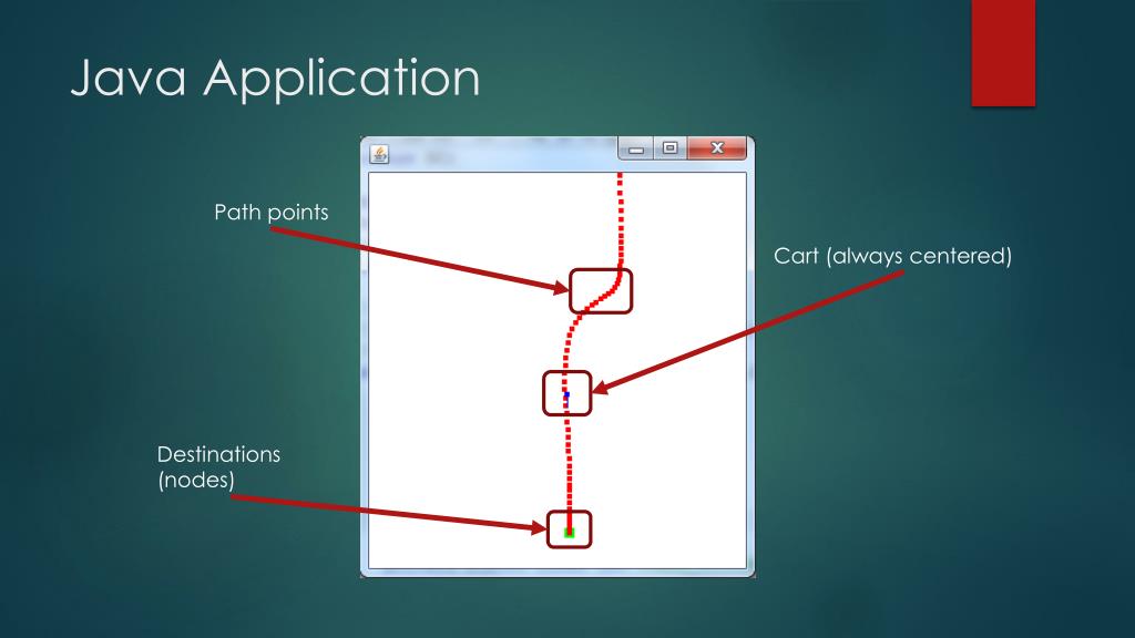 Java Application Cart (always centered) Destinations (nodes) Path points