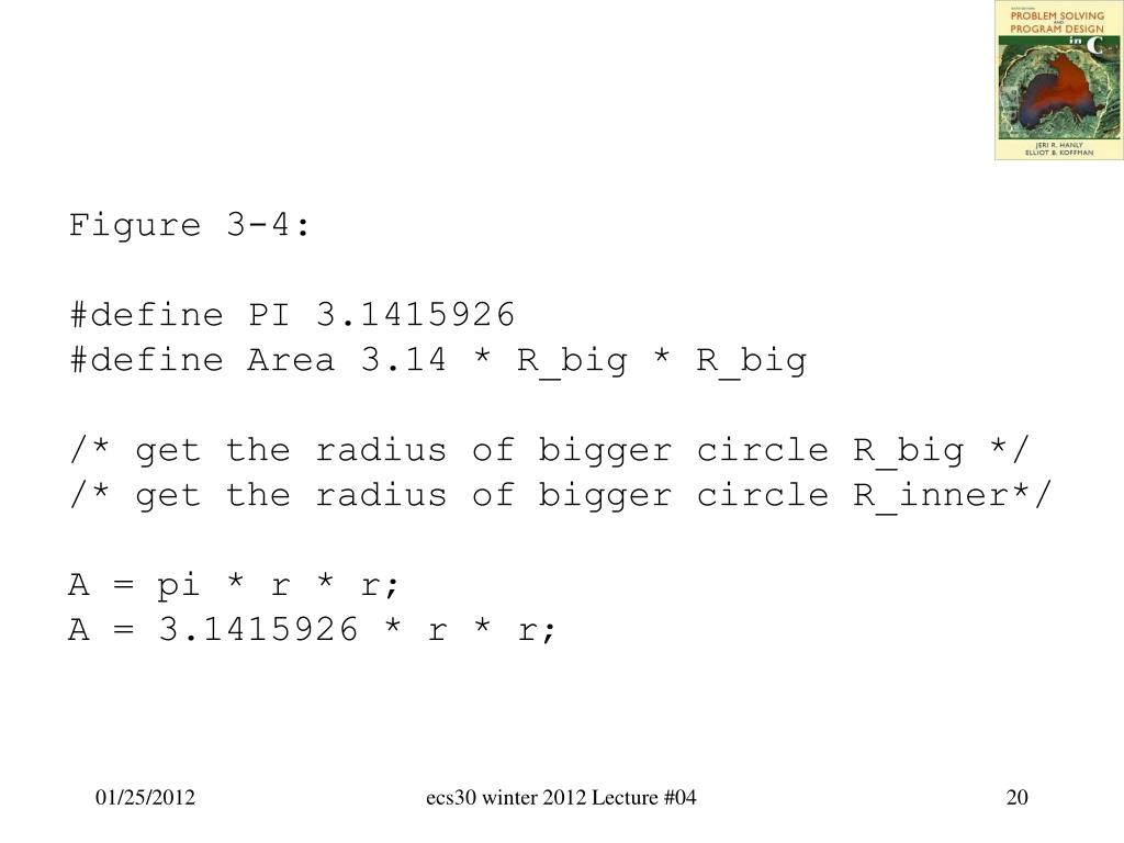 Figure 3-4: #definePI3.1415926 #define Area 3.14 * R_big * R_big /* get the radius of bigger circle R_big */ /* get the radius of bigger circle R_inner*/ A = pi * r * r; A = 3.1415926 * r * r; ecs30 winter 2012 Lecture #04