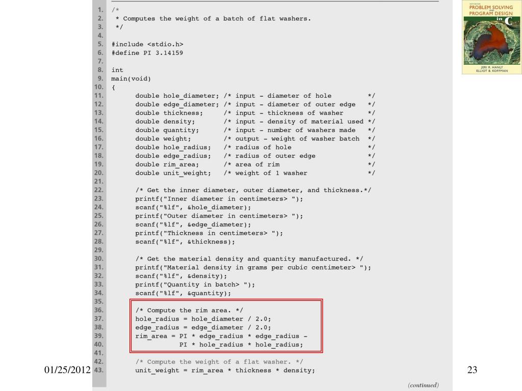 Section 13.8 #define AREA(r) (r * r * PI) double r_out, r_in, the_area; the_area = r_out * r_out * PI – r_in * r_in * PI; the_area = find_area(r_out) – find_area(r_in); the_area = AREA(r_out) – AREA(r_in); ecs30 winter 2012 Lecture #04