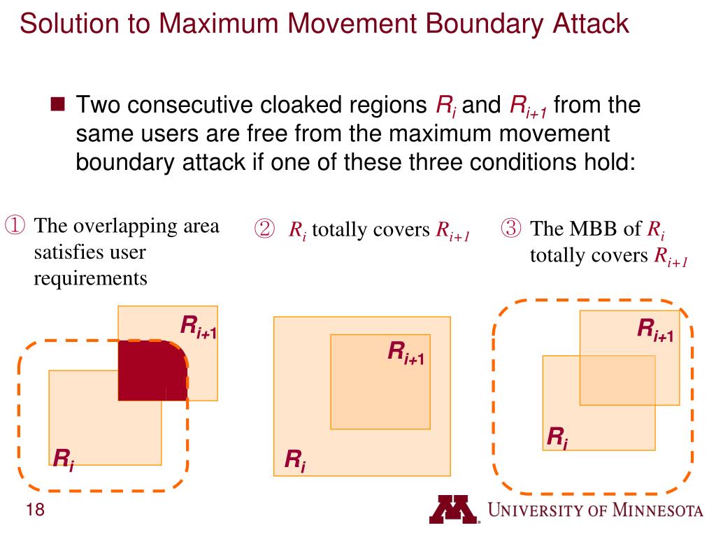Ri+1 Ri+1 Ri+1 Ri Ri Ri Solution to Maximum Movement Boundary Attack • Two consecutive cloaked regionsRi and Ri+1 from the same users are free from the maximum movement boundary attack if one of these three conditions hold: • The overlapping area satisfies user requirements • The MBB of Ri totally covers Ri+1 • Ri totally covers Ri+1 The MMB of Ritotally covers Ri+1