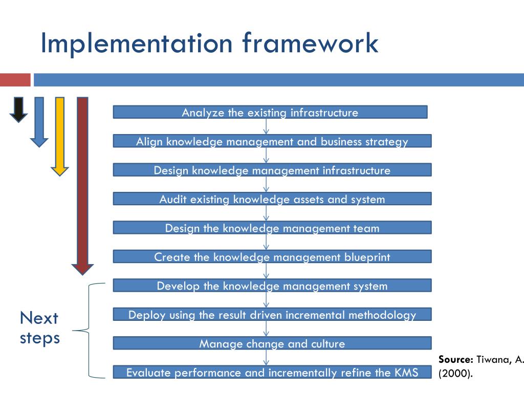Implementation framework Analyze the existing infrastructure Align knowledge management and business strategy Design knowledge management infrastructure Audit existing knowledge assets and system Design the knowledge management team Create the knowledge management blueprint Develop the knowledge management system Next steps Deploy using the result driven incremental methodology Manage change and culture Source: Tiwana, A. (2000). Evaluate performance and incrementally refine the KMS