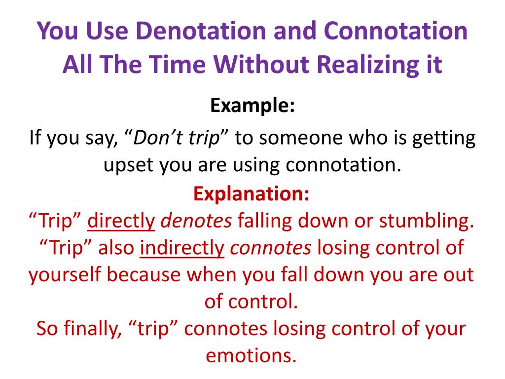You Use Denotation and Connotation All The Time Without Realizing it Example: If you say, “Don’t trip” to someone who is getting upset you are using connotation. Explanation: “Trip” directlydenotes falling down or stumbling. “Trip” also indirectlyconnotes losing control of yourself because when you fall down you are out of control. So finally, “trip” connotes losing control of your emotions.