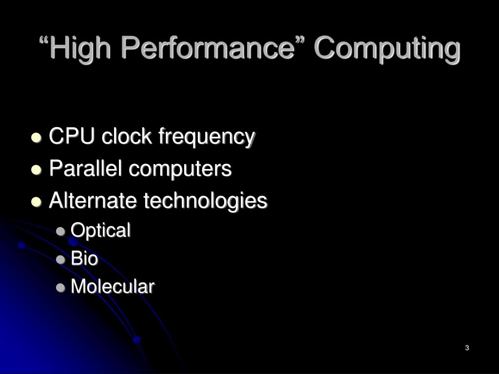 “High Performance” Computing CPU clock frequency Parallel computers Alternate technologies Optical Bio Molecular