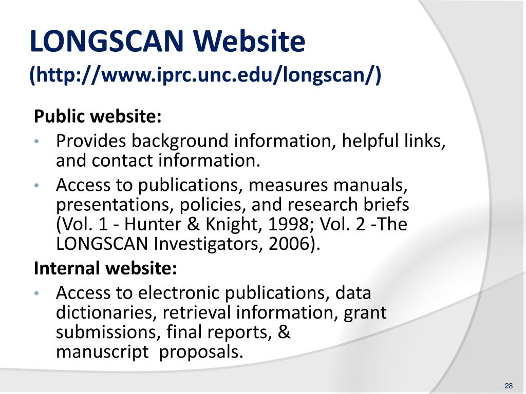 LONGSCAN Website (http://www.iprc.unc.edu/longscan/) Public website: • Provides background information, helpful links, and contact information. • Access to publications, measures manuals, presentations, policies, and research briefs (Vol. 1 - Hunter & Knight, 1998; Vol. 2 -The LONGSCAN Investigators, 2006). Internal website: • Access to electronic publications, data dictionaries, retrieval information, grant submissions, final reports, & manuscript proposals.