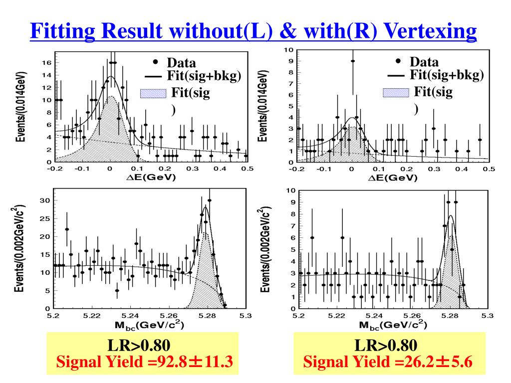 Data Data Fit(sig+bkg) Fit(sig+bkg) Fit(sig) Fit(sig) Fitting Result without(L) & with(R) Vertexing LR>0.80 LR>0.80 Signal Yield =92.8±11.3 Signal Yield =26.2±5.6