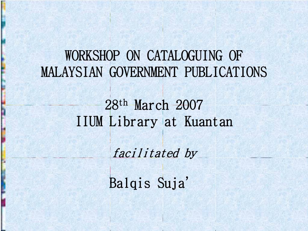 WORKSHOP ON CATALOGUING OF MALAYSIAN GOVERNMENT PUBLICATIONS 28th March 2007 IIUM Library at Kuantan facilitated by Balqis Suja’